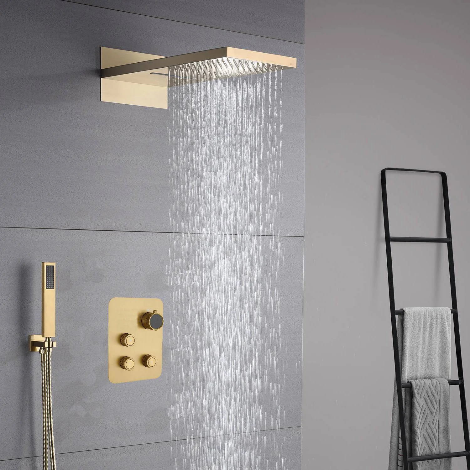 22-Inch Brushed Gold 3 Way Thermostatic Shower Faucet System with Rainfall and Waterfall