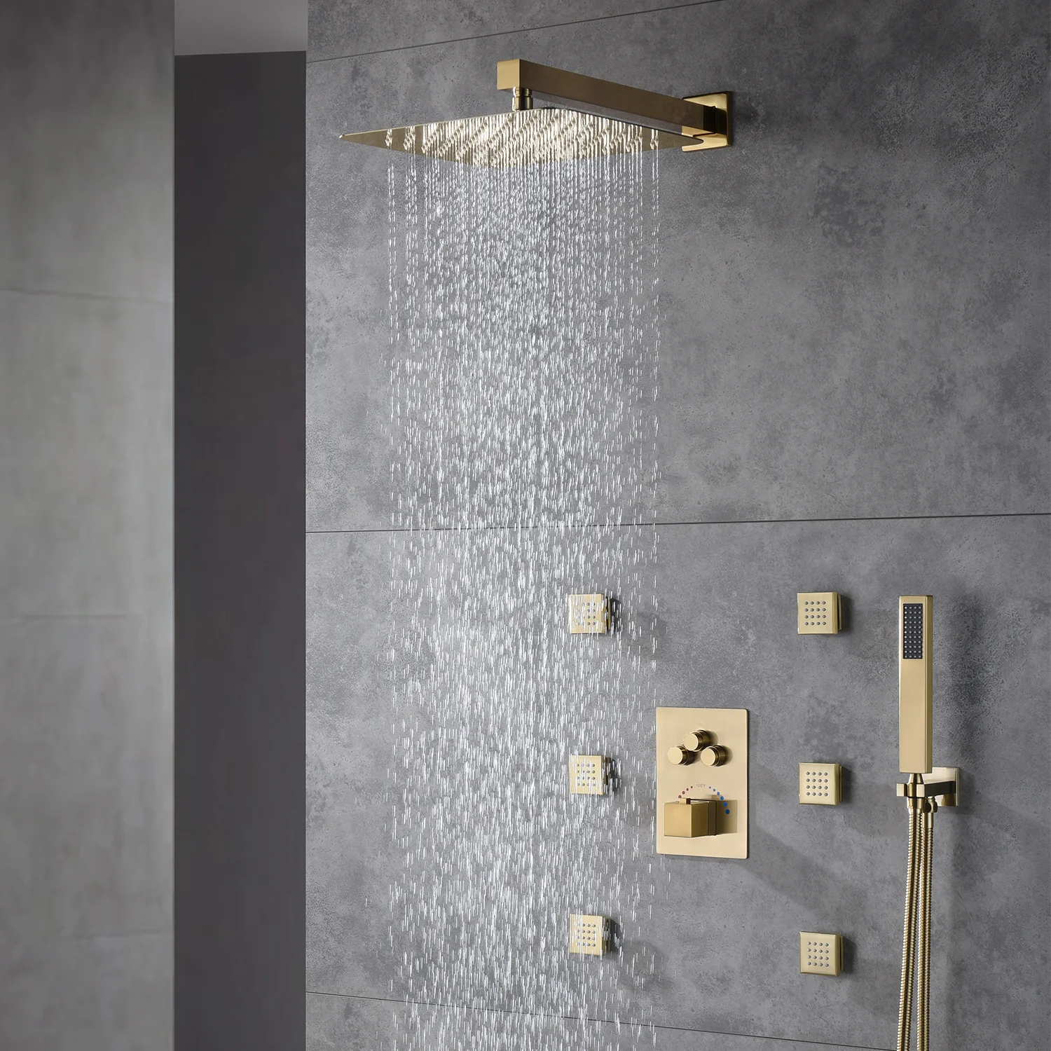 Brushed Gold Wall-Mounted 3-Way Thermostatic Shower System with Body Jets