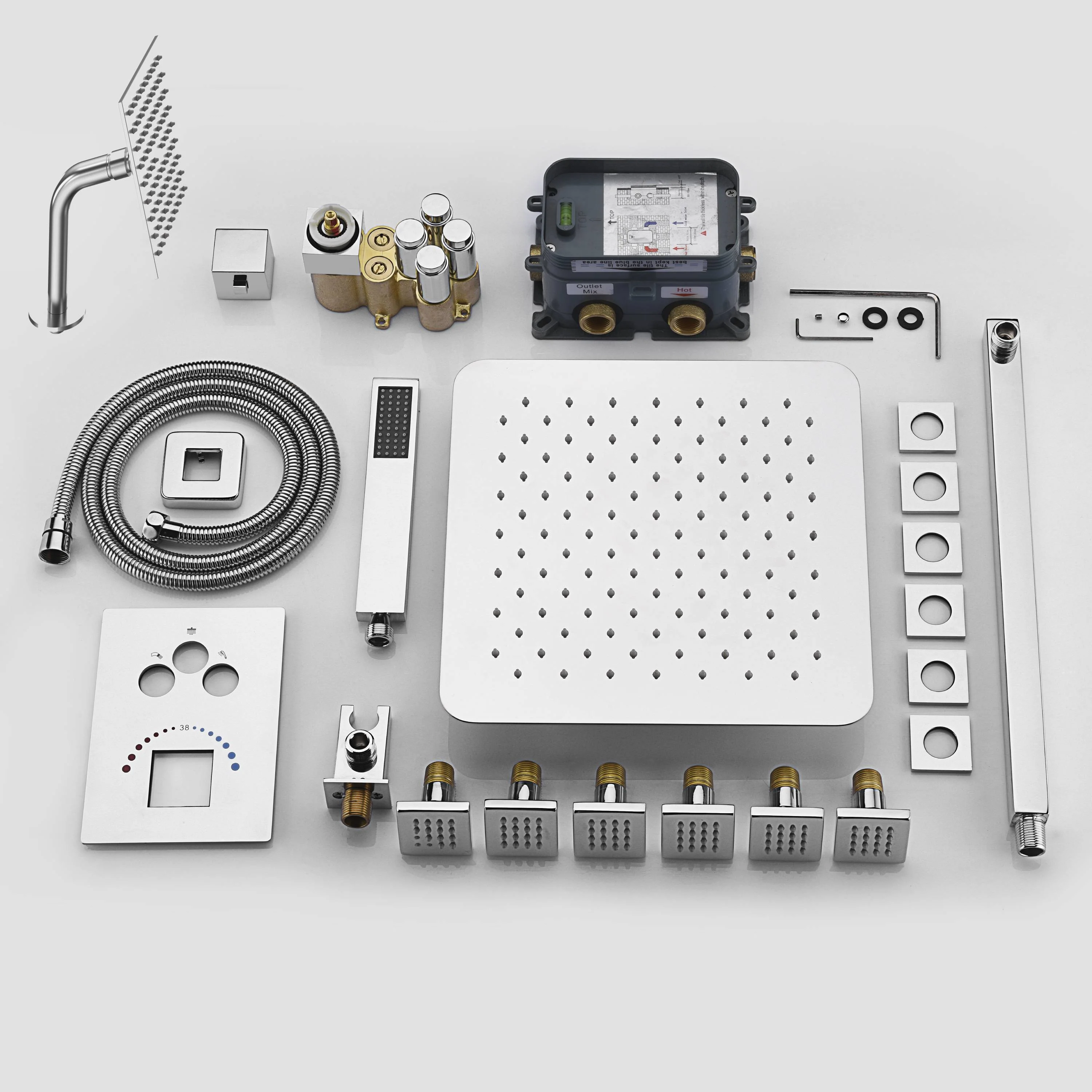 Chrome 4-Way Thermostatic Shower Faucet with 6'' Regular Head, 12'' or 16'' Rainfall Head, Body Jets, Optional LED Light