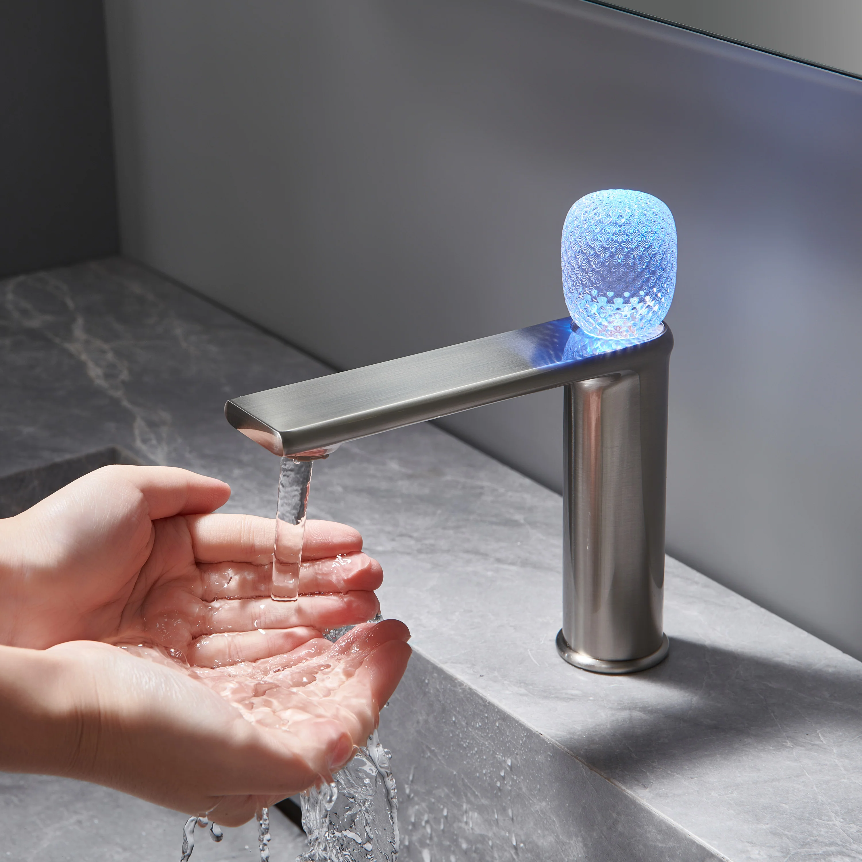 Signature Feature: Illuminating Crystal Handle. The crystal handle incorporates a subtle, integrated LED that lights up when the water is running, adding a captivating visual element and confirming water flow status with a soft glow.